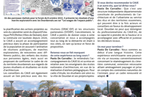 Paolo De Carvalho : Je retiendrais l’accompagnement du CAUE 91 et sa mise en relation avec les enseignants des écoles nationales d’architecture, en vue de la réalisation d’ateliers pédagogiques. Pour cadre d’étude, les étudiants ont ainsi eu la ville de Dourdan et ses projets/opérations d’aménagement (la médiathèque, le centre culturel et les espaces publics situés le long des berges de l’Orge). Car donner corps aux intuitions, aux ressentis est une chose. Permettre, par l’intervention de ces universitaires, d’ouvrir le champ des possibles, en est une autre. Ces travaux d’étudiants ont constitué le point d’orgue d’une participation souhaitée autour de réflexions mobilisatrices pour la construction du “Dourdan de demain”, permettant de sortir des traditionnelles postures qui, trop souvent, alourdissent les concertations de la population.