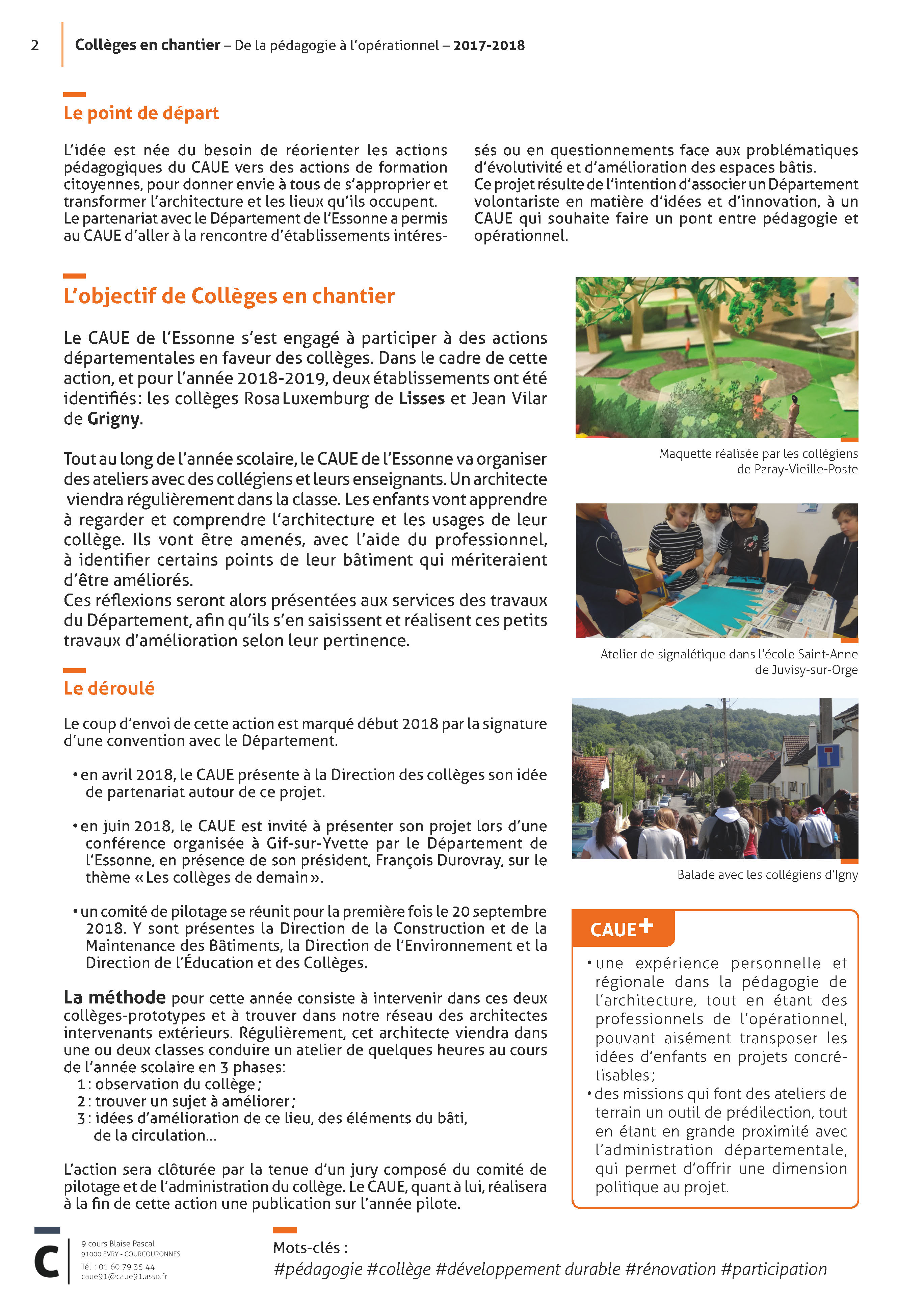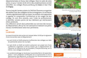 Le CAUE de l’Essonne s’est engagé à participer à des actions départementales en faveur des collèges. Dans le cadre de cette action, et pour l’année 2018-2019, deux é tablissements ont été identifiés : les collèges Rosa Luxemburg de Lisses et Jean Vilar de Grigny.