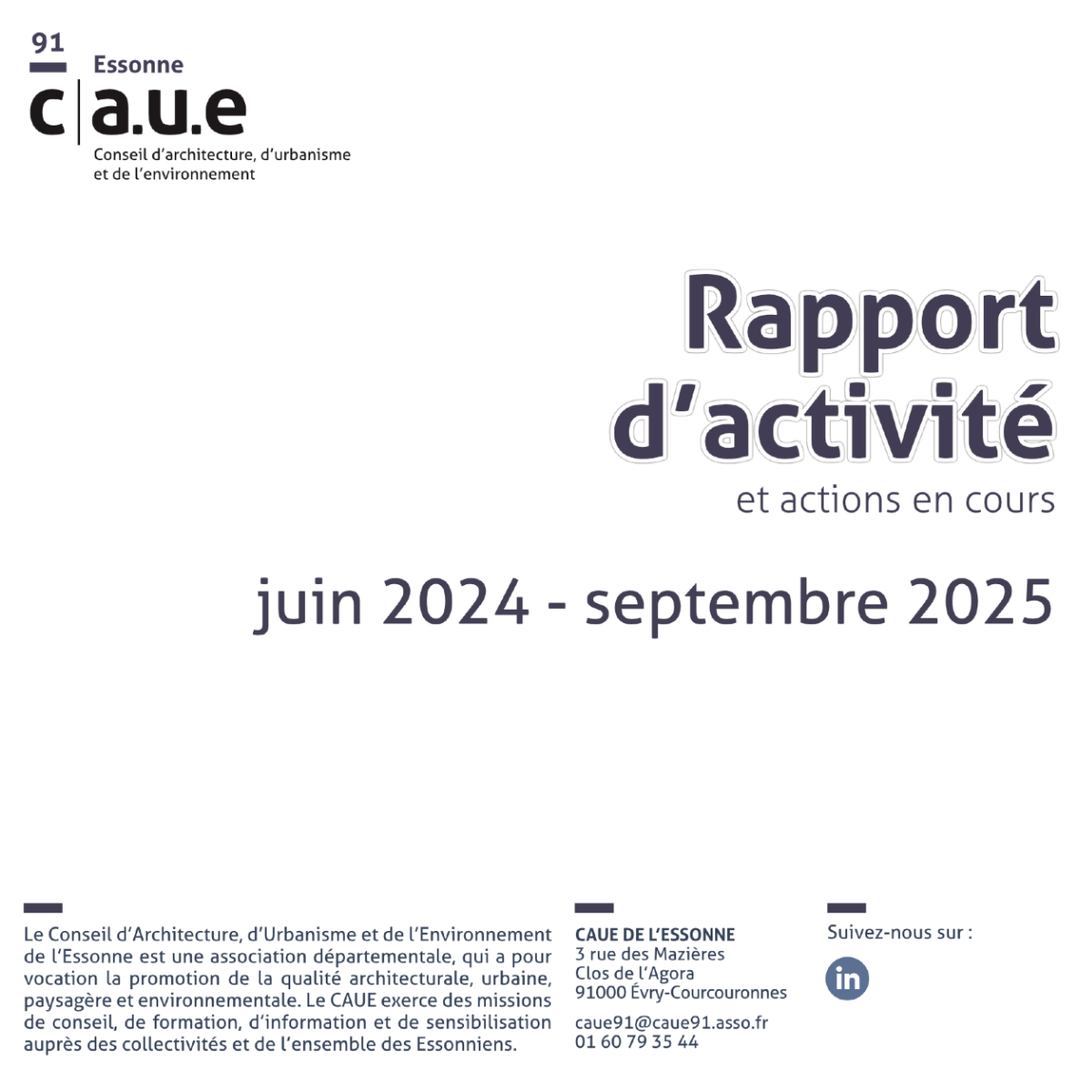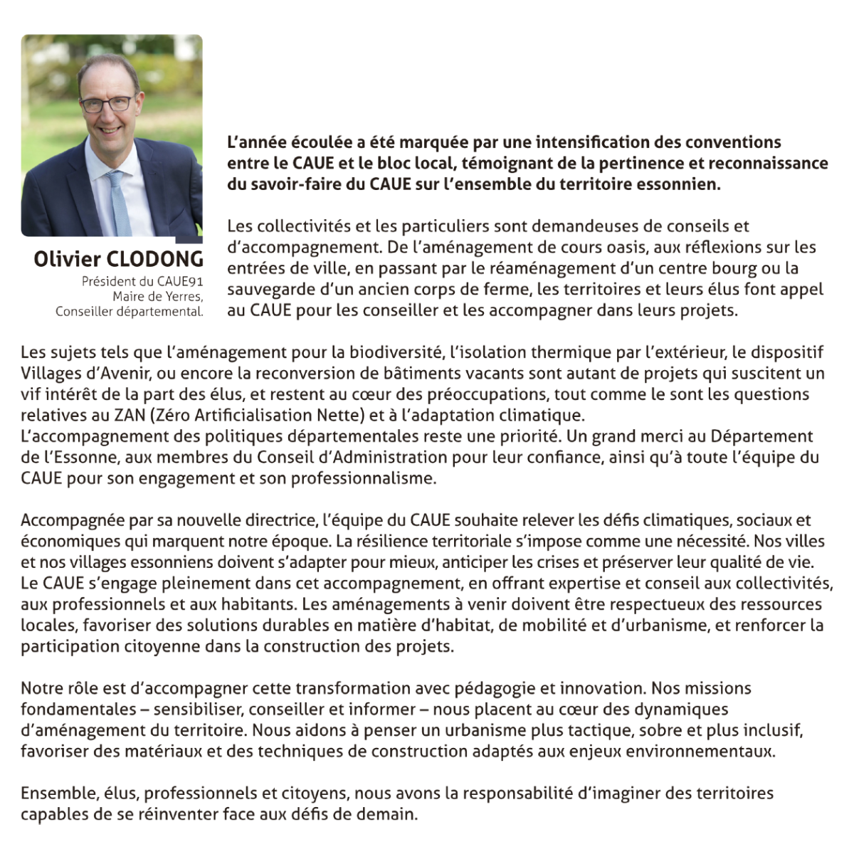 Les sujets tels que l’aménagement pour la biodiversité, l’isolation thermique par l’extérieur, le dispositif Villages d’Avenir, ou encore la reconversion de bâtiments vacants sont autant de projets qui suscitent un vif intérêt de la part des élus, et restent au cœur des préoccupations, tout comme le sont les questions relatives au ZAN (Zéro Artificialisation Nette) et à l’adaptation climatique. L’accompagnement des politiques départementales reste une priorité. Un grand merci au Département de l’Essonne, aux membres du Conseil d’Administration pour leur confiance, ainsi qu’à toute l’équipe du CAUE pour son engagement et son professionnalisme.