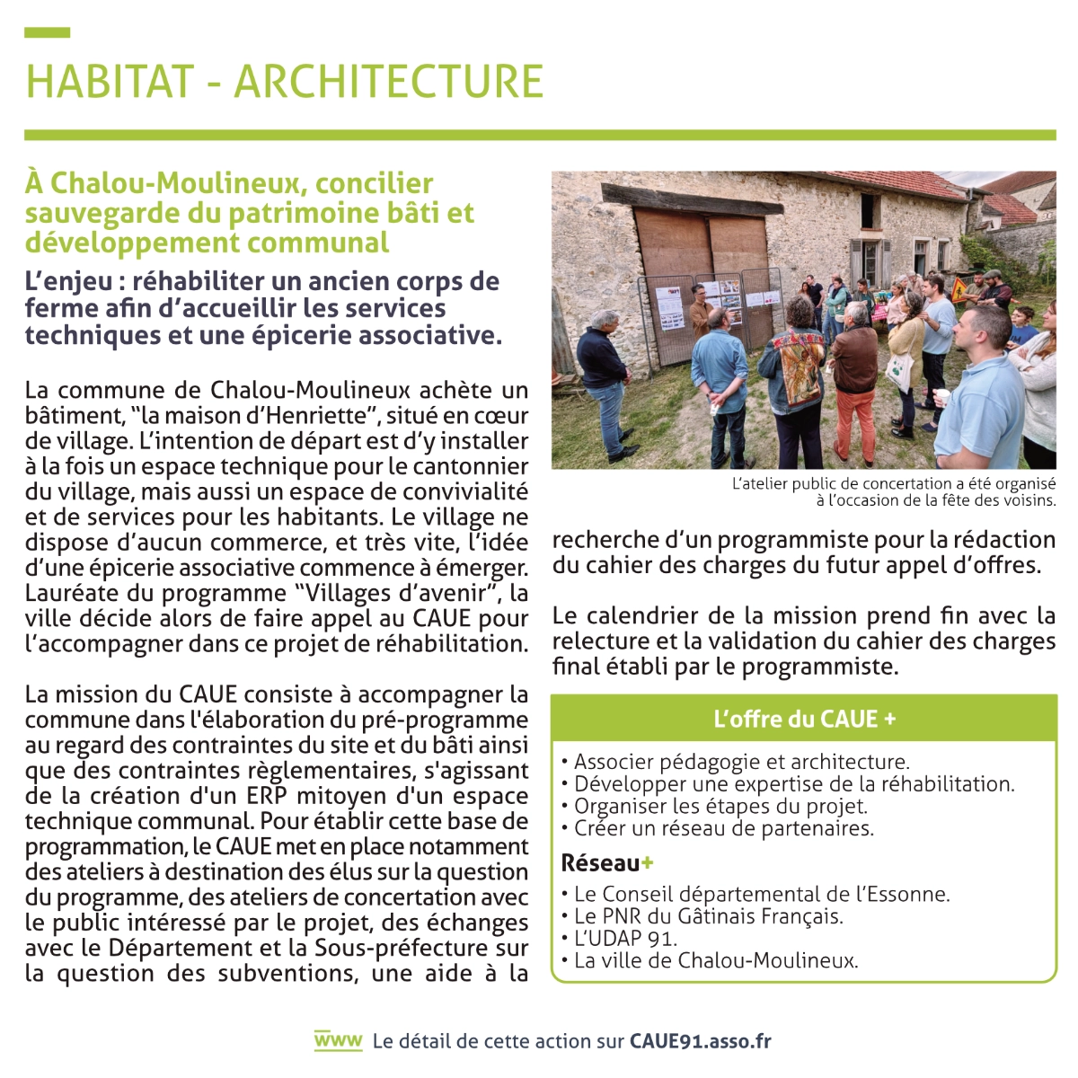 L’année écoulée a été marquée par une intensification des conventions entre le CAUE et le bloc local, témoignant de la pertinence et reconnaissance du savoir-faire du CAUE sur l’ensemble du territoire essonnien. Les collectivités et les particuliers sont demandeuses de conseils et d’accompagnement. De l’aménagement de cours oasis, aux réflexions sur les entrées de ville, en passant par le réaménagement d’un centre bourg ou la sauvegarde d’un ancien corps de ferme, les territoires et leurs élus font appel au CAUE pour les conseiller et les accompagner dans leurs projets.